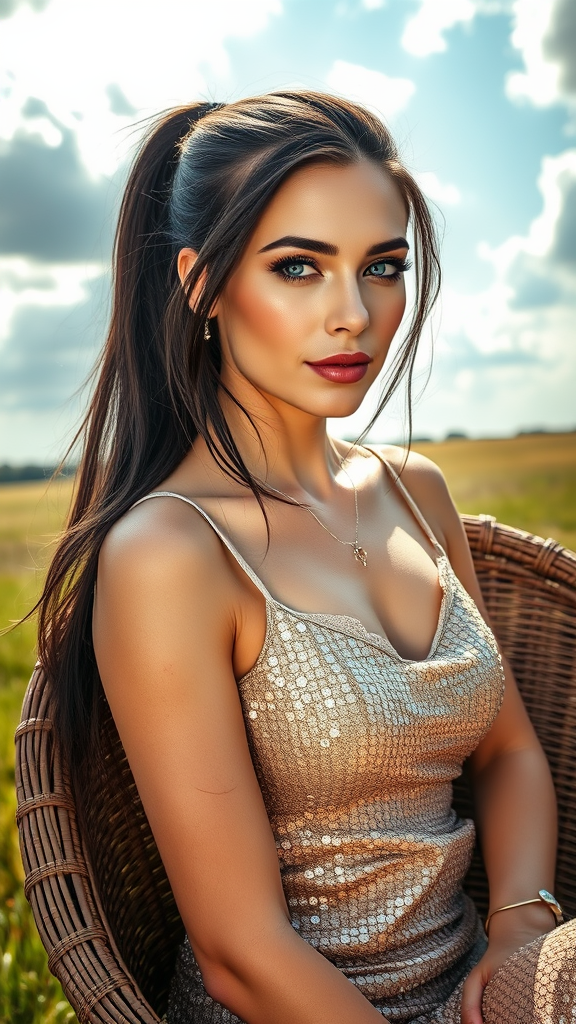 An HDR photo captures a stunning woman with long, dark brunette hair and light-blue eyes, her fair complexion accentuating her full lips. Her hair is styled in a sleek ponytail, and she wears a sleeveless, shimmering sequin gown. She is seated gracefully in a wicker chair, leaning slightly to one side, amidst a picturesque field. The partly cloudy sky allows sunbeams to filter through, creating dramatic god rays that illuminate her features. This high dynamic range image showcases vivid, rich details with clear shadows and highlights, providing a realistic and visually intense experience. The contrast is perfectly enhanced, revealing every intricate detail while maintaining a natural look. The scene is idyllic and beautifully composed, with a touch of elegance provided by her subtle jewelry.