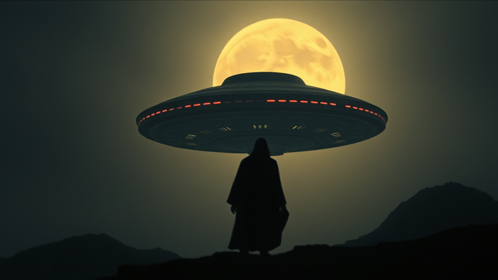 An iconic scene from a 1988 sci-fi film captured on DVD, featuring a futuristic, shadowy UFO hovering mysteriously. The image is enriched by authentic 35mm film grain, reminiscent of a bygone era. In the foreground, a journey to knowledge is symbolized by a ghostly, enigmatic figure, silhouetted against the backdrop, adding an element of timelessness. Captured through the lens of a Hasselblad H6D-100c with an XCD 85mm f/1.8, the image portrays a high-chaos, raw style with a unique aesthetic, blending the essence of vintage sci-fi with creative flair.