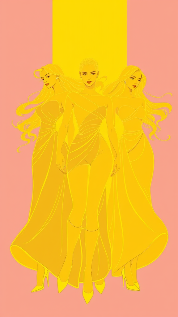 An illustration depicting three women with graceful yellow outlines, set against a tall and narrow backdrop. Each woman is styled with unique, flowing garments that echo the vibrancy of their outlines, embodying elegance and strength. The composition captures a sense of unity and individuality, with the warm hue of yellow symbolizing energy and optimism, harmoniously tying the scene together.