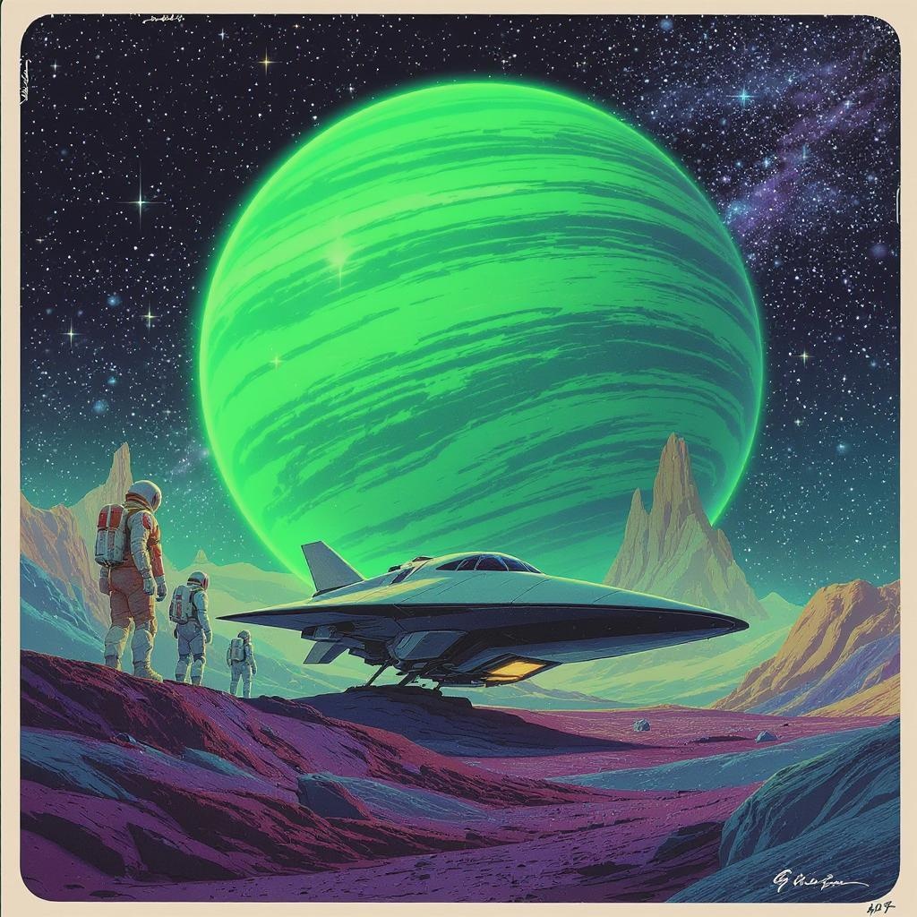 An illustration depicts a retro-inspired scene with a sleek alien spacecraft resting on the rocky surface of a distant exoplanet. Nearby, two astronauts in classic 70s-style space suits are exploring the terrain. In the distance, a colossal, swirling green gas giant dominates the sky, casting an ethereal glow over the landscape. The scene is bathed in vibrant hues, with a starry universe stretching infinitely behind, evoking a sense of wonder and adventure characteristic of vintage sci-fi artwork.