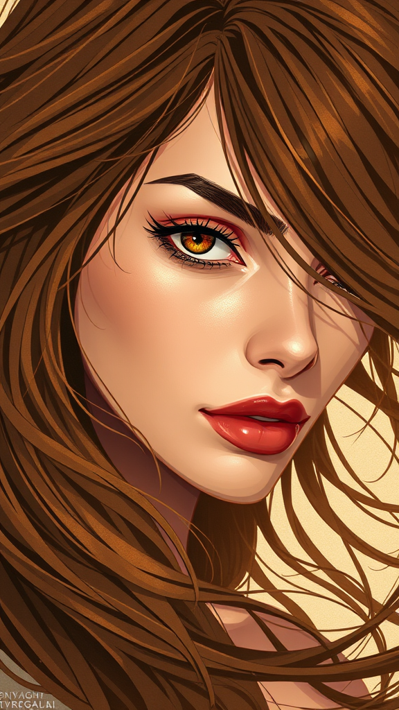 An illustration featuring a woman with flowing brown hair, capturing the essence of Ingrid Baars and J. Scott Campbell, with a color palette of warm dark beige and soft light amber. The image is in high resolution, revealing a close-up of her face that combines the captivating character style of Thiago Valdi. The woman's expression is both mysterious and charming, with intricate details enriching the overall composition. The ambiance suggests a blend of elegance and intrigue, maintaining the artistic harmony and visual appeal of the original concept.