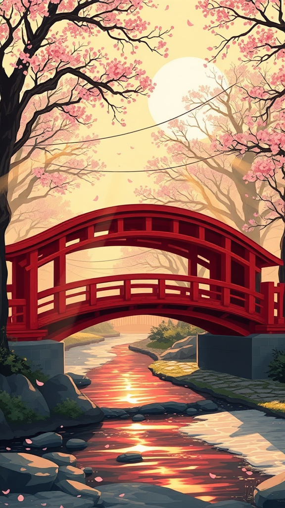 An illustration in the style of traditional Japanese art depicting an aged red wooden bridge arching gracefully over a gently winding stream. The composition is illuminated by the soft, enchanting light of the golden hour, creating an ethereal atmosphere as sunbeams dance through an abstract pattern of uniquely stylized trees. The scene strikes a harmonious balance between nostalgia and modern vibrancy, with subtle additions of delicate cherry blossom petals drifting in the breeze and intricate reflections in the water, capturing both tranquility and timeless beauty.