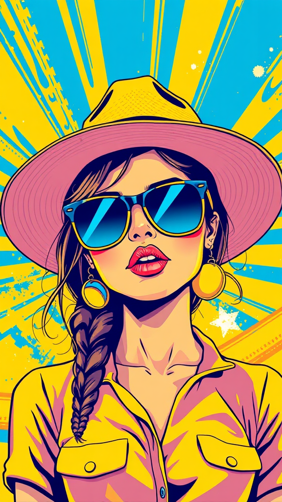An illustration of a confident girl wearing oversized sunglasses and a wide-brimmed hat, rendered in the bold and dynamic style of Mike Deodato. The design is vivid and eye-catching, featuring a striking color palette dominated by sunny yellows and vibrant azure blues. The composition is inspired by graphic artworks from the 1970s to the present, incorporating modern elements with a touch of retro influence. The background features abstract, striped patterns that enhance the overall visual appeal, creating an ultra HD experience that could easily be a centerpiece of a striking portfolio.