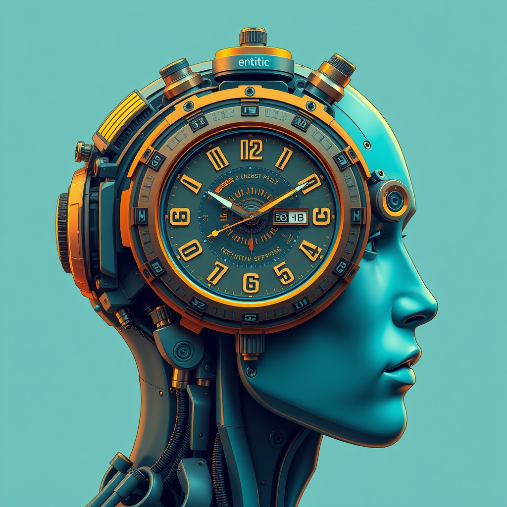 An illustration of a human head with a sophisticated clock integrated into the top, styled as a futuristic contraption, rendered with hyper-realistic detail showcasing mechanized precision. The color palette emphasizes shades of cyan and amber, with a symmetrical and intricate design reminiscent of lowbrow art. The clock features an array of gears and digital interfaces, highlighting its advanced technology. This image is inspired by Daz3D techniques, emphasizing a raw, stylized aesthetic, capturing the fusion of human intuition and mechanical exactness within a surreal, futuristic context.