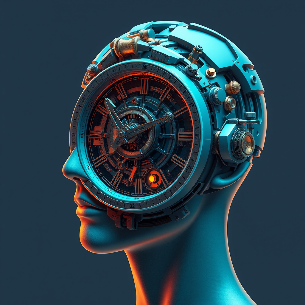 An illustration of a human head with an intricate, futuristic clock seamlessly integrated on top, featuring hyper-detailed rendering. The design showcases mechanized precision and symmetry, bathed in hues of cyan and amber. The overall style is a blend of realistic and lowbrow elements, akin to a machine-like apparatus brought to life in daz3d. Textures and components are finely detailed to evoke the sensation of a timepiece with complex, interlocking mechanisms. The scene conveys a sense of advanced contraption elegance, with a raw, unpolished aesthetic, maintaining the core concept of time and human intellect intertwining.