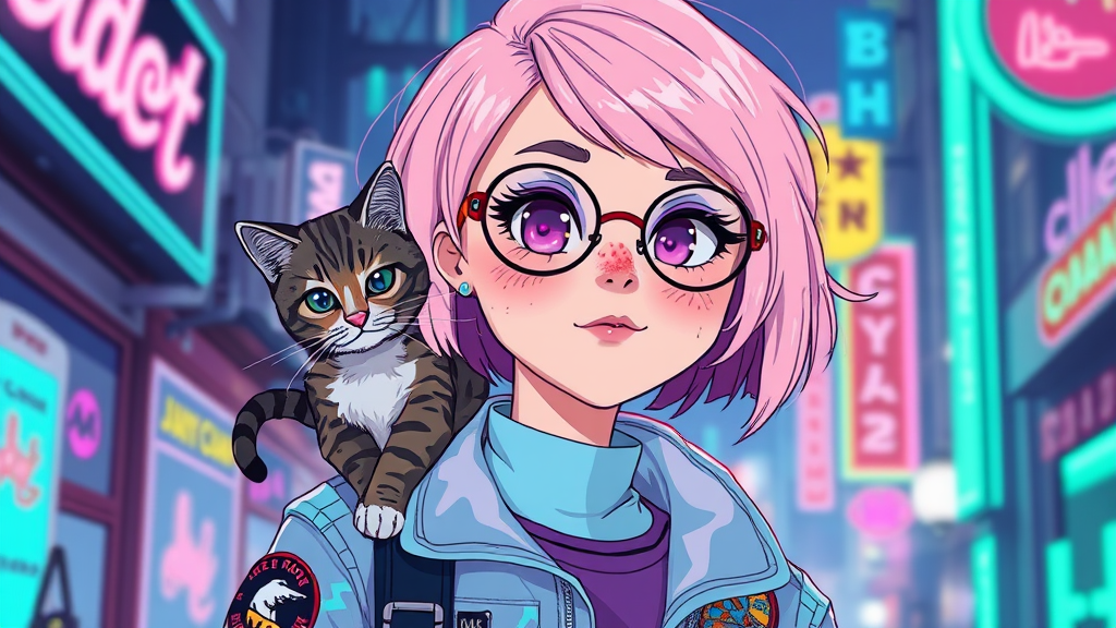 An illustration of a quirky girl with pastel pink hair styled in an asymmetrical bob, featuring prominent freckles across her cheeks and nose, rendered in a flat shading technique inspired by Gemma Correll. She has a mischievous tabby cat perched on her shoulder, its tail playfully curled around her neck. The scene is set in a vibrant cyberpunk world, where neon lights cast a soft pastel green glow that reflects in her oversized round glasses. Her attire combines futuristic elements with a vintage twist, including a holographic jacket adorned with whimsical patches. Her expression is one of curiosity and wonder as she navigates this colorful and bustling urban landscape.