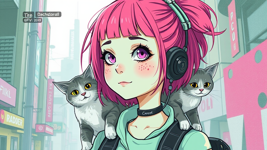 An illustration of a quirky girl with vibrant pink hair adorned with delicate freckles, in the distinctive style of Flat shading and reminiscent of Gemma Correll's art, with a playful cat perched on her shoulder. The scene is set within a cyberpunk-inspired world, blending futuristic elements with a soft pastel green color palette. The girl's attire features subtle cybernetic enhancements, hinting at the genre, while maintaining a whimsical charm. The background incorporates abstract urban elements, giving a sense of a bustling cityscape, melded through photo-manipulation techniques to heighten the surreal atmosphere.