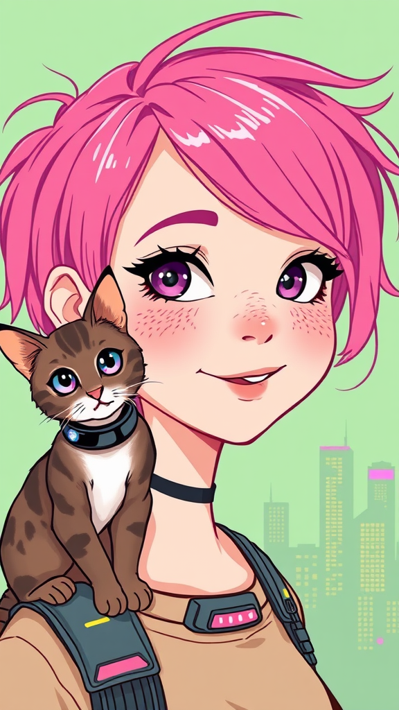 An illustration of a quirky girl with vibrant pink hair styled in fun, asymmetrical cuts, showcasing her playful personality. The artwork features flat shading techniques reminiscent of Gemma Correll's whimsical style, emphasizing her cheerful freckles. Perched on her shoulder is a curious, wide-eyed cat adorned with a sleek, cyberpunk-inspired collar, hinting at futuristic tech. Setting the scene in a pastel green backdrop, the environment features subtle hints of a neon-lit cyberpunk cityscape. Her attire is a blend of modern and retro-futuristic elements, with glowing accessories adding a unique twist. The overall composition is a photo-manipulated blend of charming illustration and edgy cyberpunk aesthetics, maintaining a playful and imaginative tone.