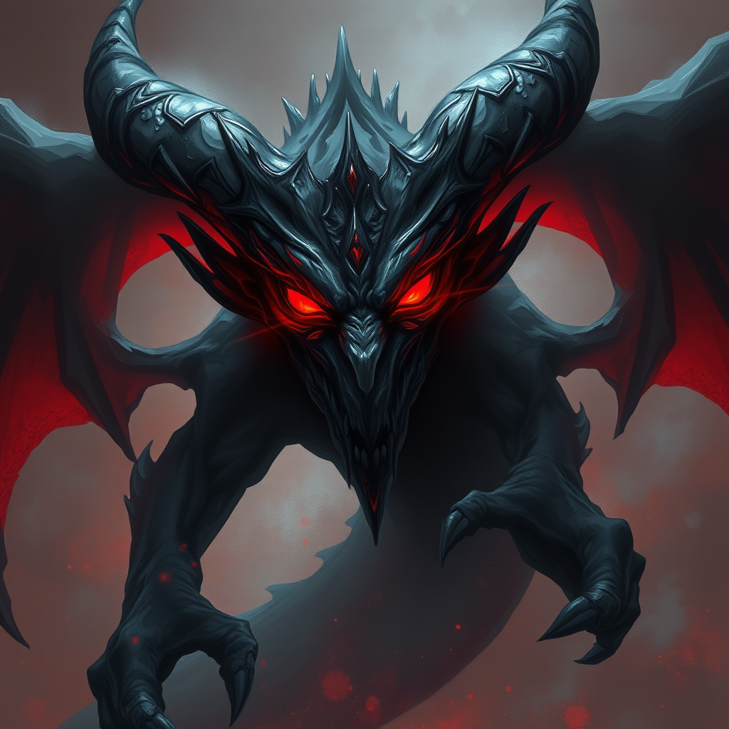 An illustration of a sinister demon with piercing red eyes, blending the ethereal style of Jessica Rossier and Brandon Woelfel's vibrant compositions, using strong contrasts with negative space. The demon exudes a dark gray and red palette reminiscent of ancient dragon art, enveloped in a mystical, hazy atmosphere. Its form is elongated and shadowy, with intricate detailing and a haunting presence, evoking a sense of fear and awe in a vertical composition.
