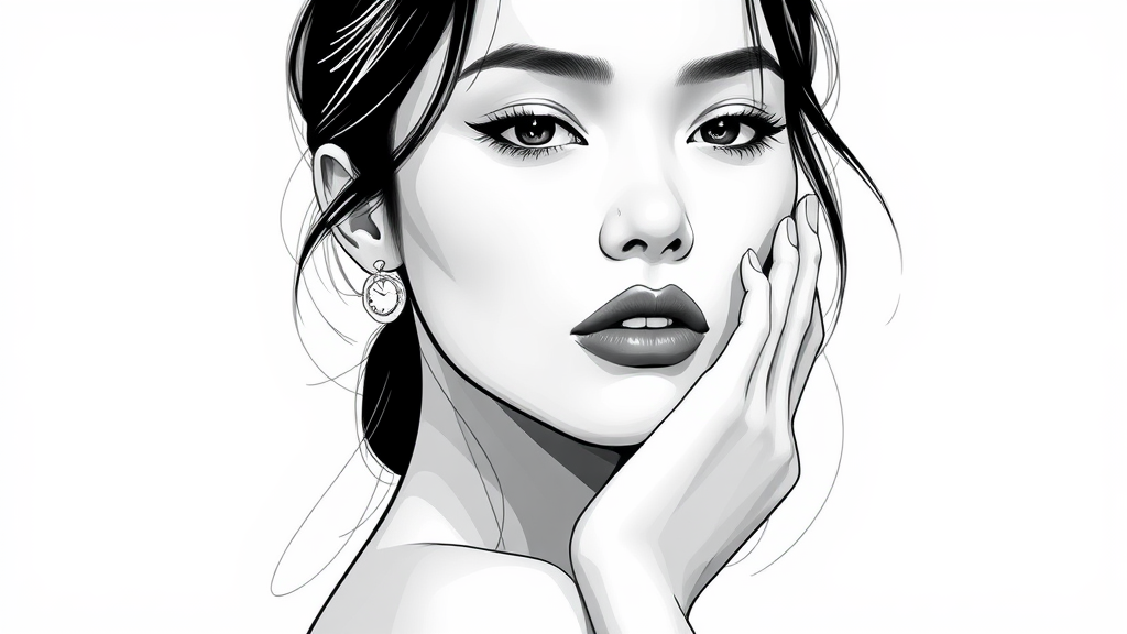 An illustration of a woman in black and white, embodying effortlessly chic elegance with serene expressions, capturing the essence of blink-and-you-miss-it detail. Influences of iconic photographers and artists like Mario Testino and Xu Beihong shine through in the meticulous line work and subtle gradients. The composition echoes Chris Labrooy's flair for innovative design while maintaining a timeless, classic allure. Her pose is both graceful and confident, set against a minimalist backdrop that enhances the focal details, creating an unforgettable visual narrative.