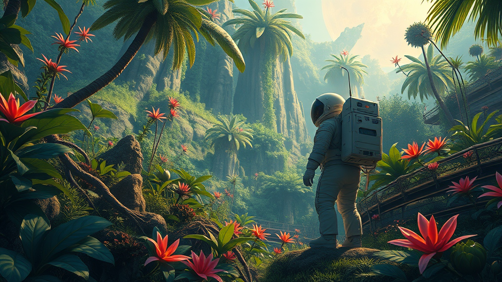 An illustration of an astronaut exploring a lush, verdant world, capturing the awe-inspiring beauty of this alien planet in a masterpiece of sci-fi atmospheric art. The scene is highly detailed and rendered in sharp focus, with an intricate array of flora and vibrant colors that create a sense of wonder and discovery. The artwork is displayed in stunning 4k resolution, embodying a style that is trending on ArtStation. Subtle enhancements bring a touch of surrealism and fantasy to the landscape, evoking a dreamlike quality while maintaining the core essence of an astronaut in an otherworldly environment.