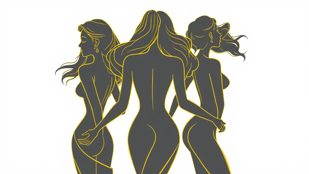 An illustration of three women with fluid, intertwining poses, their figures defined by bold yellow outlines against a minimalist background, capturing a sense of graceful movement and unity. The artwork embraces a tall and narrow aspect, drawing attention to the harmony and elegance of the composition.