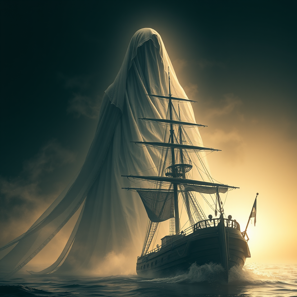 An image depicting a person enveloped in a shroud-like material, appearing to merge with the surrounding air. The composition features a high contrast between the dark background and the radiant, luminous texture of the material, evoking a sense of emergence or transformation. The scene is rendered in monochromatic tones, enhancing the mysterious and intense atmosphere. In the foreground, a hyper-realistic sailing ship is captured, draped in dramatic light from a pale sunrise. The ship, weathered and battered, is shown from a low angle, emphasizing its grandeur. The image boasts cinematic lighting, extreme detail, and conveys a masterpiece quality as if crafted by Studio Ghibli and inspired by the intricate artwork of John William Turner, creating a breathtaking visual narrative.