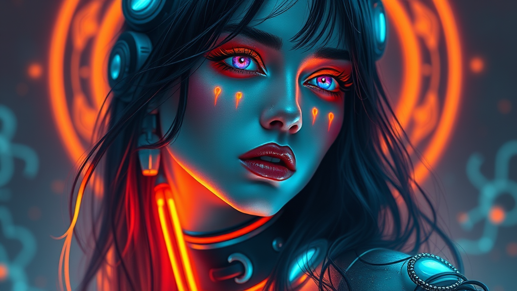 an image of a mysterious woman with luminescent neon skin, styled in the fusion of futuristic wonders, blending light indigo and amber hues, intertwined with dark white and turquoise elements, embodying kimoicore and cybermystic steampunk, evoking a sense of awe at her ethereal beauty, captured with meticulous precision in painting details.