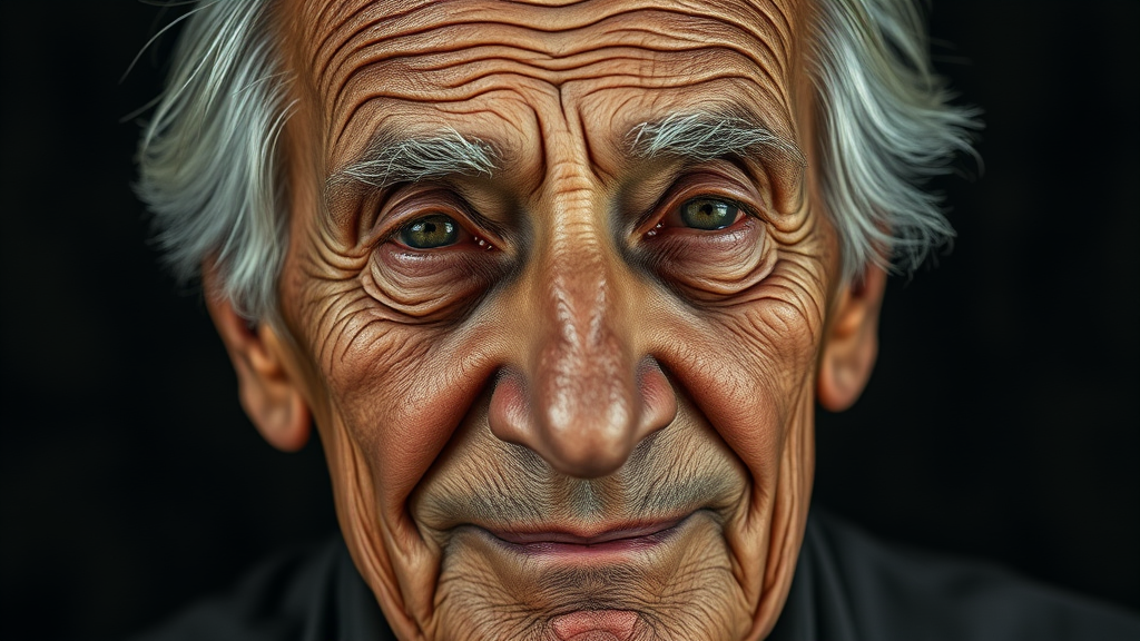An image of a weary but dignified elderly man with deep-set eyes and a lined face, set against a dark, textured background. His expression conveys profound wisdom and the trials of a long life, accented by a gentle, knowing smile. Every wrinkle tells a story of resilience, achievements, and the lessons learned through time. The muted color tones emphasize the gravity of his experiences, while a soft spotlight highlights the silver strands in his hair, adding a touch of warmth and tenderness. Highly detailed, UHD.