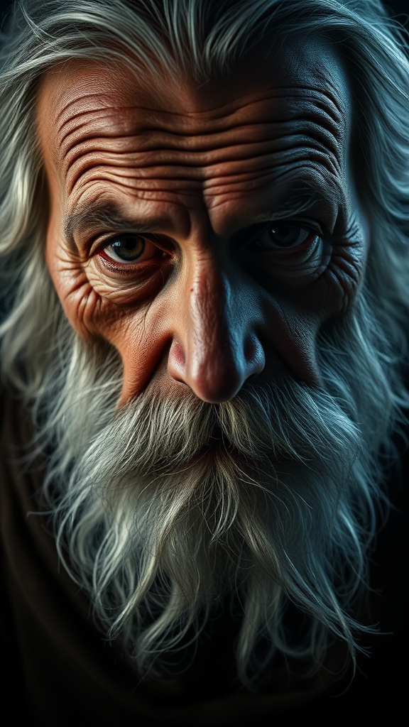 An image of a weary, elderly man with deep-set eyes and a contemplative gaze, set against a dark backdrop that accentuates the intricate details of his time-weathered features; his long, white beard and furrowed brow tell stories of perseverance and wisdom, the subtle play of light highlighting the etched lines of experience and a life richly lived; UHD quality with an aura of profound introspection.
