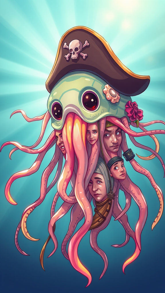 An imaginative and whimsical character portrait of an anthropomorphic jellyfish pirate, capturing the essence of the sea-faring life, with translucent tendrils flowing like wild hair. The scene is dramatically backlit, casting light rays that shimmer through the jellyfish's body, enhancing the texture and detail. A complex array of vibrant colors brings each gelatinous surface to life, creating a cartoonish yet intricate design. The pirate's costume is adorned with sea-themed accessories, including barnacle-encrusted trinkets and a shell-embellished tricorne hat. Multiple expressive faces are subtly blended into its form, adding an air of delightful confusion and maritime mystique. The illustration is rendered in high-definition vector art, appearing as though it's part of a trending gallery on art platforms, with a touch of distortion to play with the perception of this oceanic marauder.
