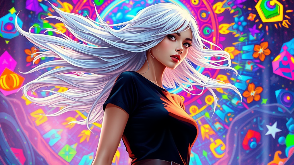An imaginative depiction of a woman with striking white hair flowing gracefully, wearing a sleek black t-shirt as she stands poised in a vibrant fantasy realm. Her presence exudes an aura of colorful cyberpunk energy, reminiscent of detailed manga artistry. The scene is illuminated with hues akin to the works of Hans Zatzka, blending the ornate intricacies of stained-glass craftsmanship with an infusion of dynamic Marvel Comics vibrancy. Inspired by Yanjun Cheng's style, the background bursts into a radiant mural of brilliant colors, encapsulating an ethereal yet futuristic atmosphere that captures the imagination.