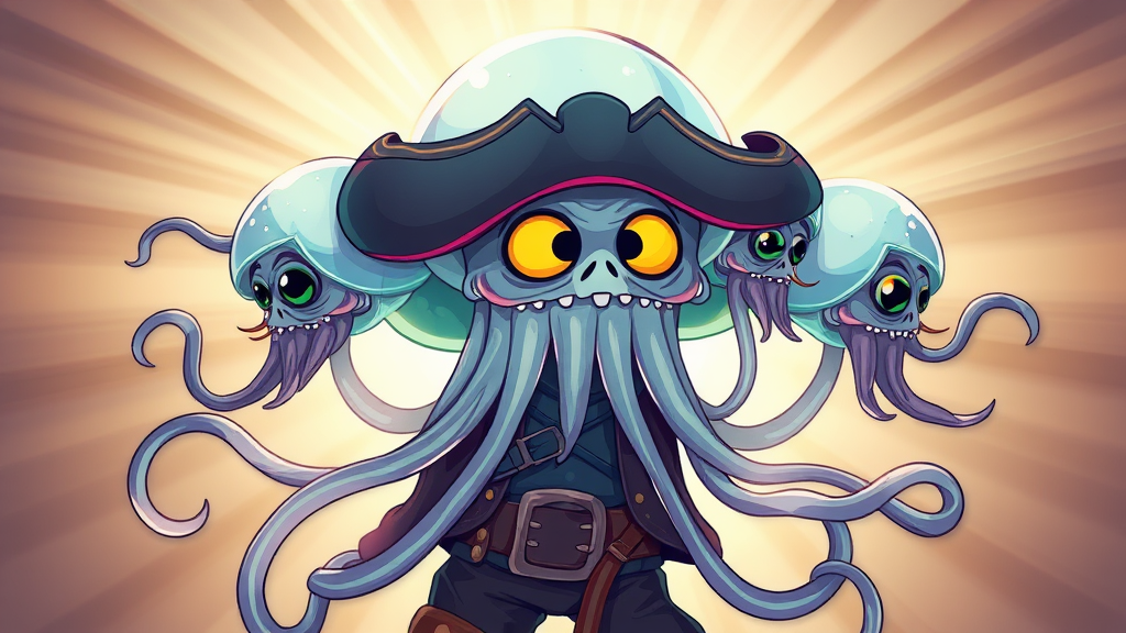 An imaginative depiction of an anthropomorphic jellyfish pirate, featuring a character portrait design study with multiple heads in a dynamic pose. The jellyfish pirate is backlit, with dramatic light rays highlighting its translucent, tentacle-filled form. The highly detailed artwork showcases its pirate attire with playful cartoon elements, trending on art platforms with a closeup perspective. The use of vector art and clipart style adds a whimsical, distorted quality to the character, infusing it with vibrant colors and expressive features.