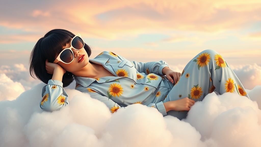 An imaginative image of a whimsical woman lounging gracefully atop soft, fluffy clouds, she wears oversized sunglasses and pastel blue pajamas adorned with playful sunflower patterns, her short dark hair styled in a chic bob cut. The serene backdrop features a dreamy sky in pastel hues, blending soft pink and blue, with gentle cloud formations. Captured in the signature style of Jimmy Marble, the scene resonates with muted earthy tones and soft, harmonious textures.