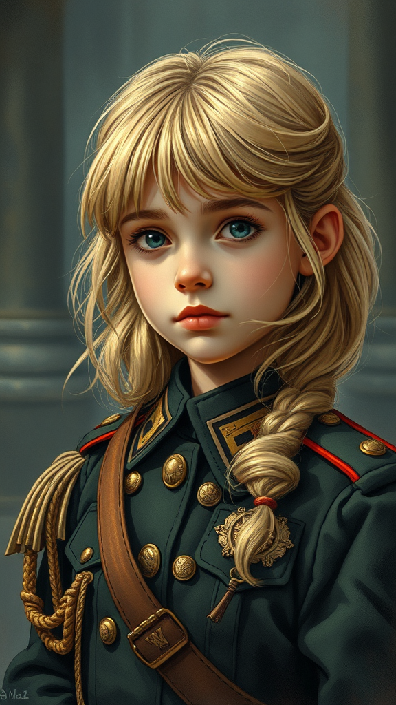 An imaginative portrait featuring a young girl adorned in an officer's ceremonial tunic, her loose blond hair framing her face, set against a dieselpunk backdrop. Inspired by Ian McQue's signature style, the scene embodies the essence of the British Empire with meticulously intricate details and a vintage, retro vibe. The illustration is rich with hyper-detailed elements, showcasing a soft cinematic light with low contrast and dim, soothing tones. The ambiance is captured in a slate gray atmosphere, adding a subtle depth to the composition. Despite the complexity, it maintains a harmonious blend, framed within a faded, low-saturation color palette. The overall presentation exudes a unique charm that reflects an imaginative and alternate historical universe.