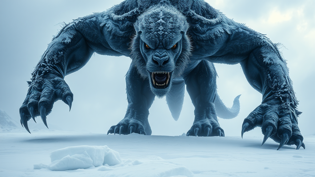 An immense snow beast towers on the frozen expanse, embodying the essence of epic fantasy scenes. Its form resembles a formidable manticore, yet its presence is uniquely inspired by explosive wildlife and terragen landscapes. Its dark gray fur melds into the icy backdrop, a reflection of caninecore influences, and a strong, striking facial expression captures the viewer's gaze. Rendered in hyper-realistic detail, each muscle and feature is vividly realized, as if captured in a hyper-detailed, UHD masterpiece. The creature's massive claws grip the snow with intent, suggesting movement and purpose. In the style of 2D game art and mythical beasts, it looms with a visage akin to a National Geographic photo, its atmosphere cold and detached. Echoes of Salvator Rosa’s influence permeate the scene, crafting a setting so intensely realistic it transcends mere digital art, creating a masterwork of fantasy.