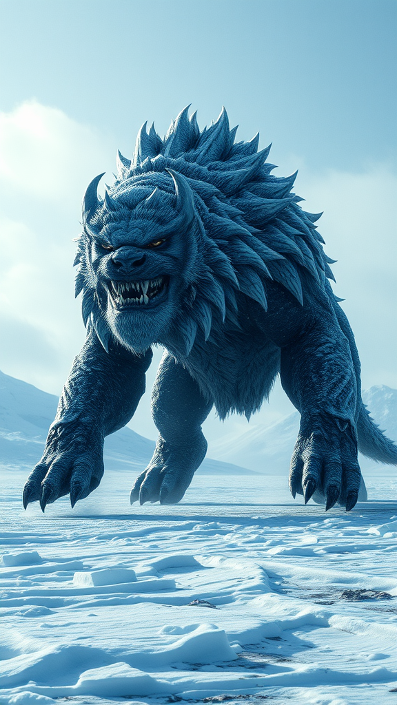 An immense snow beast towers on the icy expanse, captured in the essence of epic fantasy landscapes. Its physique merges elements of a manticore, infused with explosive wildlife energy, while cloaked in dark gray hues. The scene resonates with caninecore aesthetics, with the creature exuding a commanding facial expression of intensity. Rendered in hyper-realistic detail and precision, it embodies the prowess of a mythical beast, with 32k UHD quality capturing every intricate nuance. Moving with a powerful stride across the frozen terrain, its formidable claws punctuate the snow-covered ground. This 2D game art evokes the grandeur of legendary creatures, reminiscent of a National Geographic photo that conveys a cold and detached atmosphere. Inspired by the works of Salvator Rosa, the digital masterpiece encapsulates the enigmatic allure of fantasy, with realistic hyper-detailed rendering that immerses the viewer in its mystical realm.