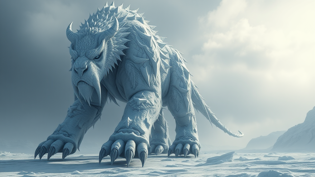 An immense snow creature stands defiantly on the icy terrain, evoking the grandeur of epic fantasy. Its form is reminiscent of a manticore, exuding an aura of explosive wilderness and raw power. The scene, crafted with the meticulousness of terragen, envelops the creature in a dark gray atmosphere that resonates with the aesthetic of caninecore. Its face bears a strong, piercing expression, each detail rendered with hyper-realistic precision, capturing the essence in 32k UHD quality—a masterpiece of visual storytelling. The beast strides purposefully, its massive claws coming into contact with the snow, embodying the archetype of mythical beasts. This 2D game art scene possesses the realistic intensity of a National Geographic photo, yet carries a cold, detached atmosphere akin to the works of Salvator Rosa. Crafted in the realm of digital fantasy art, the piece stands as a hyper-detailed testament to a mystical world captured in unparalleled detail, a true masterpiece.