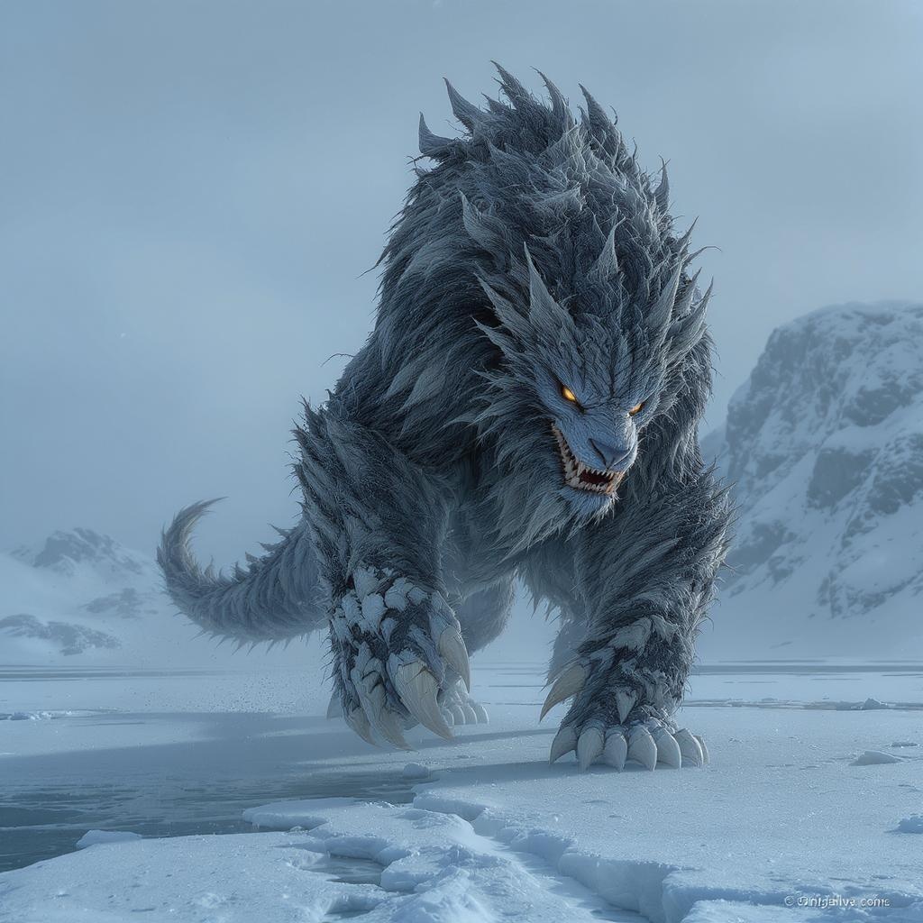 An immense snow creature towers on the icy expanse, evoking the grandeur of epic fantasy scenes. It resembles a fearsome chimera with manticore influences and an explosive aura of wildlife, rendered in dark gray hues with a hint of canine ferocity. Its strong facial expression radiates power and intelligence, captured in a hyper-realistic, ultra-detailed rendering at 32k UHD resolution, a true masterpiece. The creature lumbers forward, its claws leaving deep impressions in the snow, a testament to its formidable presence. This 2D game art draws upon mythical beast representations, channeling a photo-realistic quality akin to a National Geographic image. The atmosphere is cold and detached, reminiscent of Salvator Rosa's dramatic style, yet it retains a hyper-realistic focus on intricate details. Digital artistry merges with fantasy elements to convey a world where mythical and real intertwine.