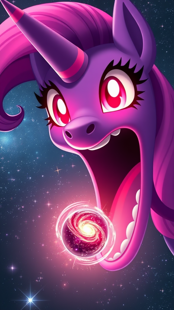 An immense Twilight Sparkle from My Little Pony, vastly larger than a galaxy, gliding through the cosmos; a tiny galaxy hovers before her open mouth, captured in an extreme close-up as she prepares to consume it, her eyes wide and ablaze with radiant red light, enhanced with photo-realistic detail, the vastness of her presence contrasted by the shimmering miniature cosmos about to be swallowed.