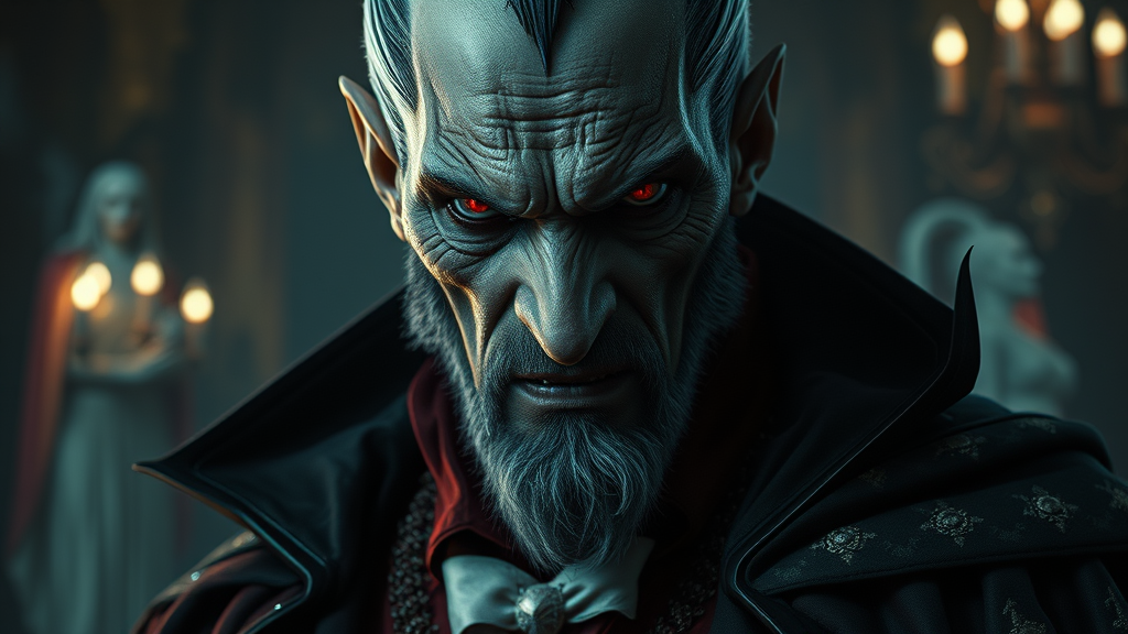 An imposing, ancient Strigoi vampire exudes an aura of alpha male superiority, his features etched with ageless wisdom and unyielding power. His eyes burn with a feral intensity, set within a face that speaks of centuries steeped in darkness and lore. Every detail of his otherworldly visage is ultra-detailed, capturing the essence of horror and majesty intertwined. His presence is an enigmatic blend of elegance and dread, as if the shadows themselves bend to his will. Draped in garments that echo the opulence of forgotten eras, he stands as a sentinel of night, a living testament to the immortality of his kind. The atmosphere around him is vivid and hyper-realistic, revealing the haunting contrast of light and shadow in a scene that pulses with high dynamic range, underscoring his dominion over the arcane. In the elongated twilight of his realm, the environment pulsates with an eerie, surreal clarity, whispering tales of his eternal reign and the dread that follows in his wake.