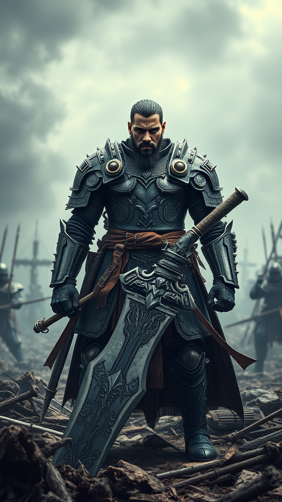 An imposing figure stands amid a war-torn battlefield, clad in intricately detailed armor that glistens with dark, muted tones. The elaborate weapon in their grasp mirrors the armor's complexity, hinting at countless battles fought and won. Their stance, militant and resolute, speaks of unyielding strength and determination. The face carries a powerful expression of restrained rage and intense focus, an aura of raw emotional energy. Shadows cast dramatically across the scene, enhancing the tribal dark fantasy vibe of this epic composition. Subtle modifications bring an added depth to the character's presence, creating a tableau of power and unwavering defiance.