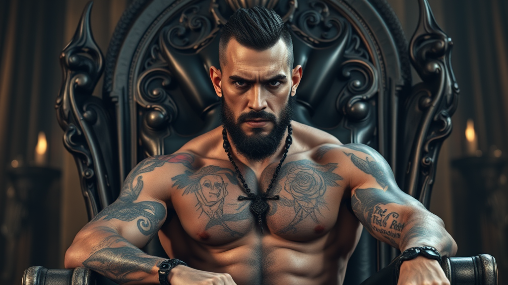 An imposing, rugged, and intense man exuding a punk aesthetic sits confidently on a grand throne. His tough demeanor is accentuated by tattoos that span his muscular arms and neck, creating an intricate tapestry of ink against his textured, weathered skin. He gazes directly at the viewer with a fierce, defiant expression, embodying a modern warrior’s essence. The setting echoes the grandeur of a fantasy world reminiscent of an epic saga, with rich, atmospheric details enhancing the scene. The portrait embraces hyperrealism, showcasing every nuance of his rough skin and stark features with astonishing clarity. Cinematic lighting casts dramatic shadows and highlights, adding depth and intensity to the image. The composition captures him in full length, emphasizing his commanding presence and the intricate design of the throne, all rendered in 8k resolution for breathtaking detail and realism.
