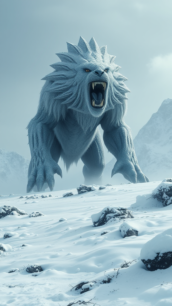 An imposing snow beast towers on the icy expanse, embodying the grandeur of epic fantasy scenes with a manticore's majestic grace. It stands amidst explosive wildlife, captured with terragen techniques and rendered in dark gray hues. The creature, exuding caninecore strength, displays a fierce and determined facial expression. Every inch of this mythical beast is realized in hyper-realistic, hyper-detailed rendering, achieving a masterpiece at 32k UHD quality. As it advances toward the snow, its claws carve through the frosty landscape. This scene, inspired by the grandeur of 2D game art and mythical lore, offers a blend of cold and detached atmosphere reminiscent of a National Geographic photo filtered through the lens of Salvator Rosa. The digital artistry elevates the fantasy into a hyper-realistic portrayal, crafting a vivid masterpiece in the realm of mythical marvels.