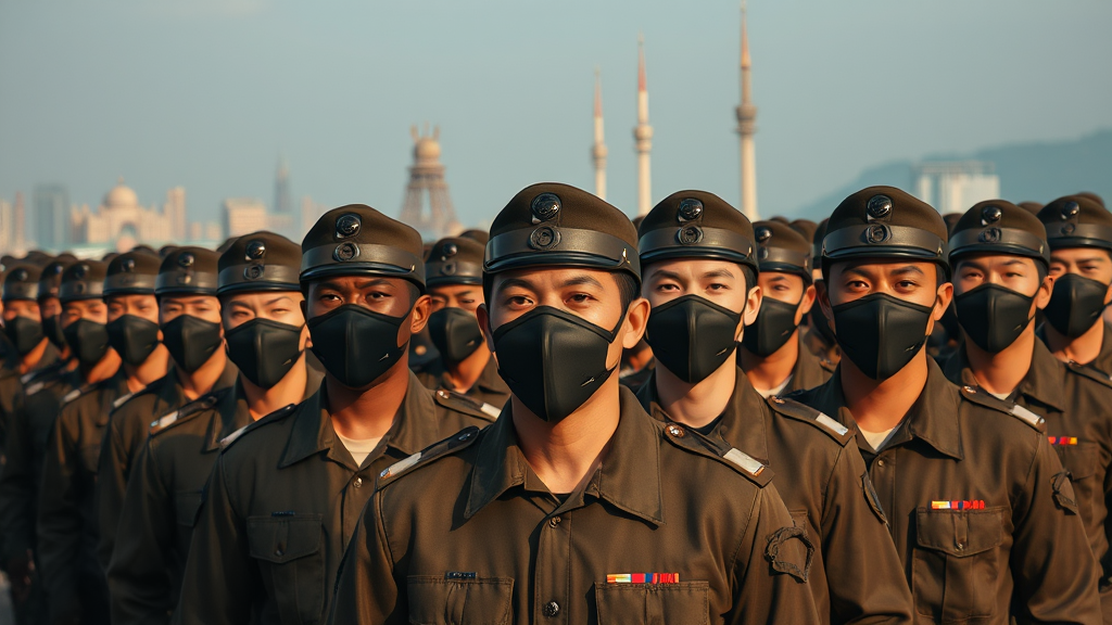 An impressive and diverse army of men from various races, unified by identical masks reminiscent of Tyler the Creator's Chromakopia, their faces obscured yet intriguingly expressive. Clad in cohesive military attire with hints of Korean military aesthetics, the soldiers march in perfect unison, their regimented movement captured with the stark, dramatic flair of military photography. The atmosphere is charged with an electric sense of purpose and solidarity, each individual an integral part of a larger, harmonious force. Subtle creative elements weave through the scene, such as the play of light and shadow on their masks, hinting at the uniqueness beneath the uniformity, while the backdrop features a horizon blending cultural landmarks subtly symbolizing their shared mission.