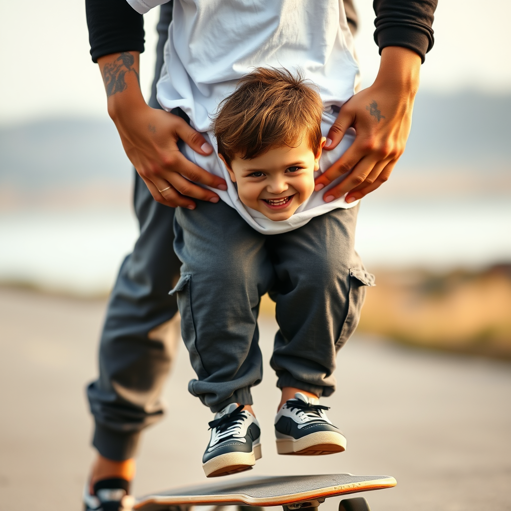 An impromptu photograph captures a joyful moment between a young boy and his dad, the boy beaming with a wide smile as he balances on a skateboard. He sports a loose-fitting white T-shirt that exudes a playful yet cool vibe, paired with dark grey cargo joggers. His youthful excitement is mirrored in his eyes as he grasps the strong, tattoo-adorned hands of his dad, whose lower half is visible, clad in black loose-fitting long sleeves. Both wear Nike SB skateboard shoes, showcasing a contrast between new and worn comfort. This image beautifully encapsulates the essence of balance, a perfect face-to-body ratio, and the pure, shared joy between generations, all enveloped in the soft, natural light of a serene backdrop. Captured through the lens of a Sony α9 II camera with a Sony FE 100-400mm f/4.5-5.6 GM OSS lens, the photo radiates a high-contrast effect, providing an ultrahigh-definition representation of this timeless and heartfelt moment.