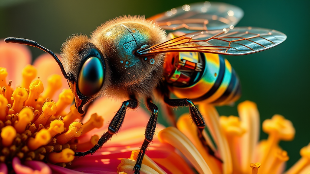 An incredibly detailed macro shot of a cybernetic bee, its metallic body glistening under soft light as it collects vibrant pollen in intricate patterns; the fusion of futuristic technology and nature seen in the delicate mechanical wings and luminescent circuits visible beneath the translucent outer shell; tiny gears and wires subtly integrated into its form, reflecting a spectrum of colors while hovering amidst bright, pollen-dusted flowers, capturing the harmony between robotics and the natural world.