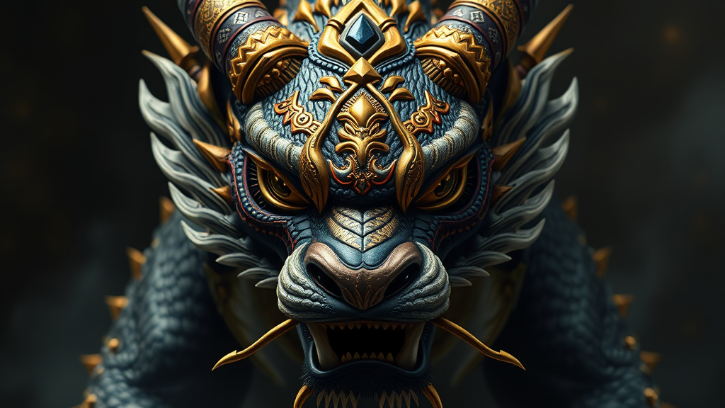 An incredibly detailed portrait of a fierce Singha facing forward, showcasing intricate details and hyper-realism with influences from Thailand's mythological imagery. The design incorporates elements of dragoncore and dark fantasy inspired by the art style of Antonio J. Manzanedo. The composition is stunning, with a focus on ultra-realistic textures and patterns that bring the mystical creature to life. The background adds depth and mystery, enhancing the mythical aura of the Singha.