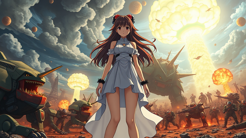 An incredibly powerful anime girl stands as the central focus, her presence commanding with an aura that blends ethereal beauty and unstoppable strength. Created by the visionary talents of Hideaki Anno, Katsuhiro Otomo, and Rumiko Takahashi, this cinematic masterpiece captivates audiences with its storytelling brilliance. The poster showcases a tumultuous world where monstrous creatures and colossal mechs clash in an epic battle, their forms beautifully detailed and vividly rendered in 8k resolution. Above, the sky is an apocalyptic canvas, illuminated by the glow of nuclear explosions, adding a dramatic essence to the scene. The composition screams box office hit with its meticulous attention to design, capturing the intense energy and excitement that only legends in anime can craft.