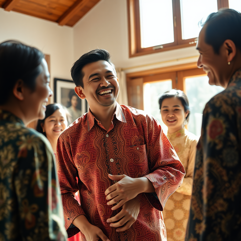 An Indonesian father in his 30s, dressed in an intricately patterned batik shirt, laughs heartily as he assists his young son in a sunlit traditional living room. Around them, other family members are visible, their faces illuminated by natural morning light, each donning exquisitely detailed clothing that reflects the vibrant culture. The room is filled with warmth and bright colors, capturing the heartfelt joy and connection shared among them, with each family member’s expression revealing genuine affection and happiness.