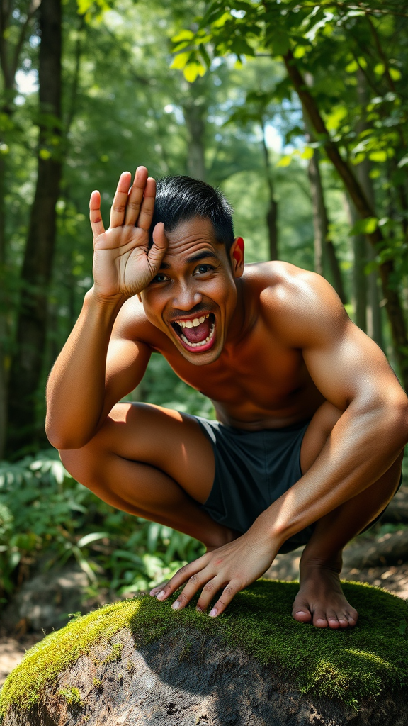 An Indonesian man, his mouth open as wide as possible showing his teeth, one hand placed respectfully on his forehead as if shielding his eyes, his expression searching intently around him. He squats on a moss-covered rock, surrounded by a lush, pristine forest that feels alive with vibrant greenery and the sound of rustling leaves, his skin glistening lightly under the dappled sunlight filtering through the canopy, creating a striking contrast that adds depth to the scene, his muscles poised and ready, capturing the raw essence of nature in a hyper-realistic depiction without any imperfections.