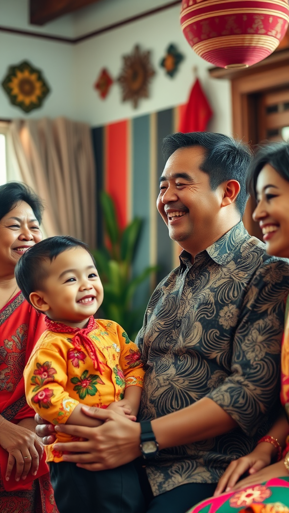 An Indonesian man in his 30s wearing an intricately designed batik shirt laughs heartily while playfully instructing his young son, who mirrors his smile. Surrounding them are family members beaming with joy in a vibrant traditional living room, the space alive with colorful textiles and patterned decorations. Morning light streams through the window, illuminating the scene. Each figure showcases exquisitely detailed attire and expressive facial features that beautifully convey authentic familial bonds. The cinematic camera aesthetic captures this candid moment, emphasizing raw emotion and connection, creating an atmosphere of warmth and togetherness.