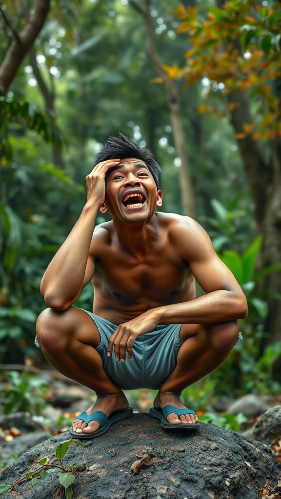 An Indonesian man squats on a rock in a lush, vibrant forest, his mouth wide open revealing his teeth, eyes scanning the surroundings as if searching intently for something. One hand rests thoughtfully on his forehead, his fingers splayed out in an expression of concentration and respect. The detailed texture of the trees and foliage creating a hyper-realistic backdrop complement his poised stance, capturing a moment of deep contemplation and curiosity amidst nature's embrace.