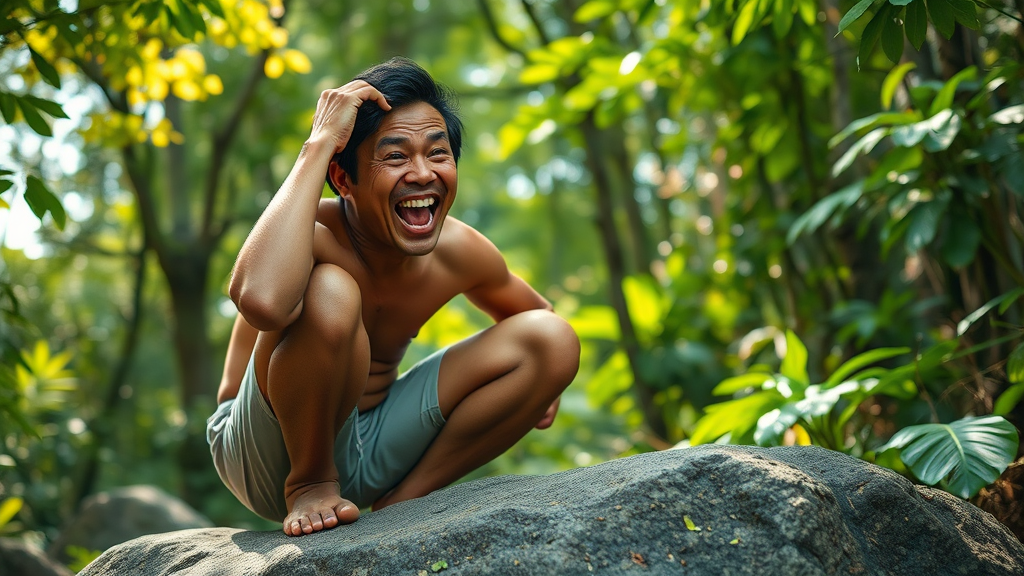An Indonesian man squatted on a smooth rock, his mouth open wide, teeth gleaming, while his eyes darted around as if searching for something elusive. His hand rested on his forehead in a gesture of curiosity and respect. The lush, vibrant forest around him was alive with detail, from the intricate patterns on the leaves to the soft shafts of sunlight filtering through the canopy. The hyper-realistic scene captured the essence of exploration, with each element in harmonious balance, reflecting an untamed natural beauty.
