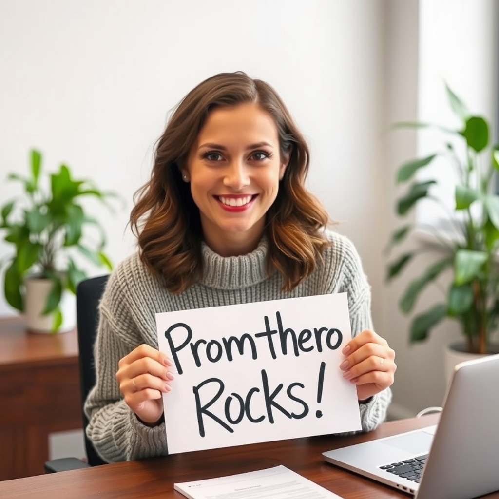 An Instagram photo features a woman sitting at a desk, wearing a cozy light grey sweater. She's smiling at the camera while holding a handwritten sign that reads "Promthero Rocks!" In the background, on either side of her, are blurred office plants adding a hint of greenery to the serene setting.