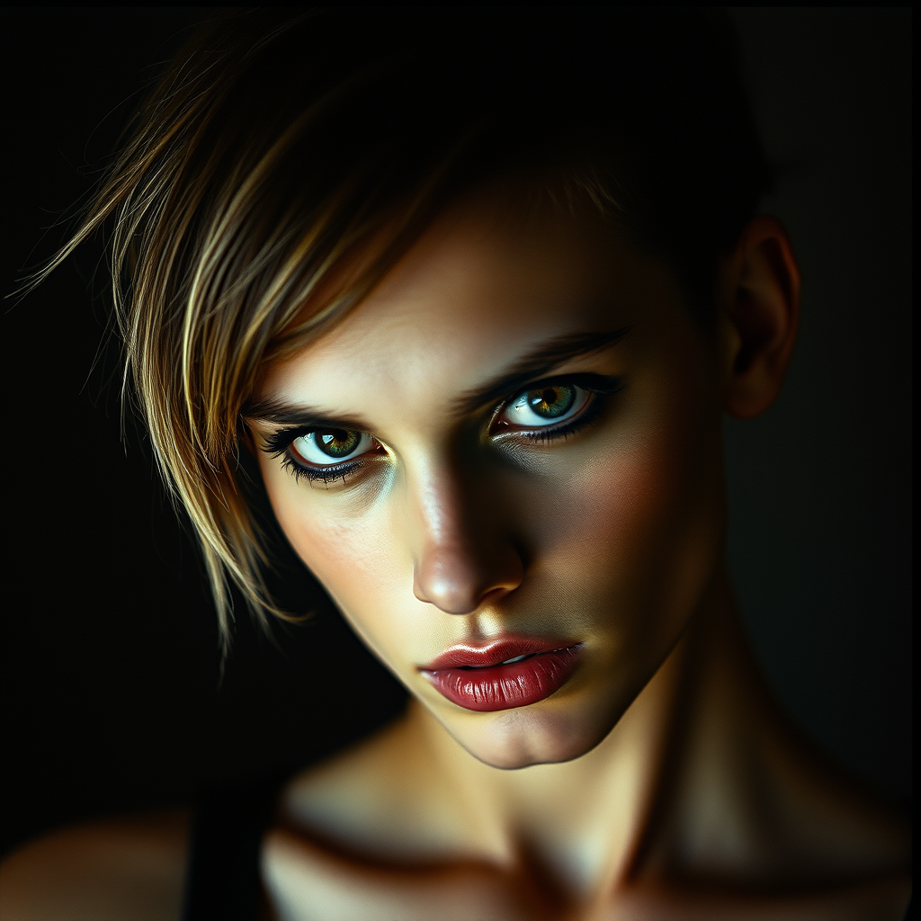An intense portrait of a young woman featuring an edgy haircut and captivating eyes. The image is captured in a high-contrast style, utilizing strong shadows and highlights to accentuate the model's defined features. The photograph, taken with a vintage film camera and a fast prime lens, exudes a gritty and raw ambiance. This powerful portrait is ideal for fashion editorials, marketing campaigns, or as a compelling piece of wall art.