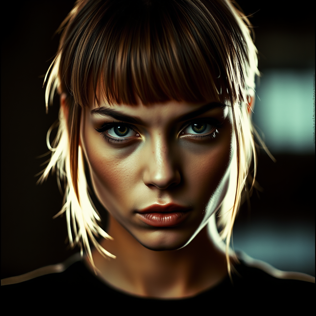 An intense portrait of a young woman with an edgy bob and captivating gaze. The photograph is captured in a high-contrast manner, with pronounced shadows and bright highlights accentuating the model's defined features. Taken on film with a fast prime lens, the image exudes a gritty and unrefined essence. The portrait is ideal for fashion editorials, marketing campaigns, or as a bold and eye-catching decorative piece.