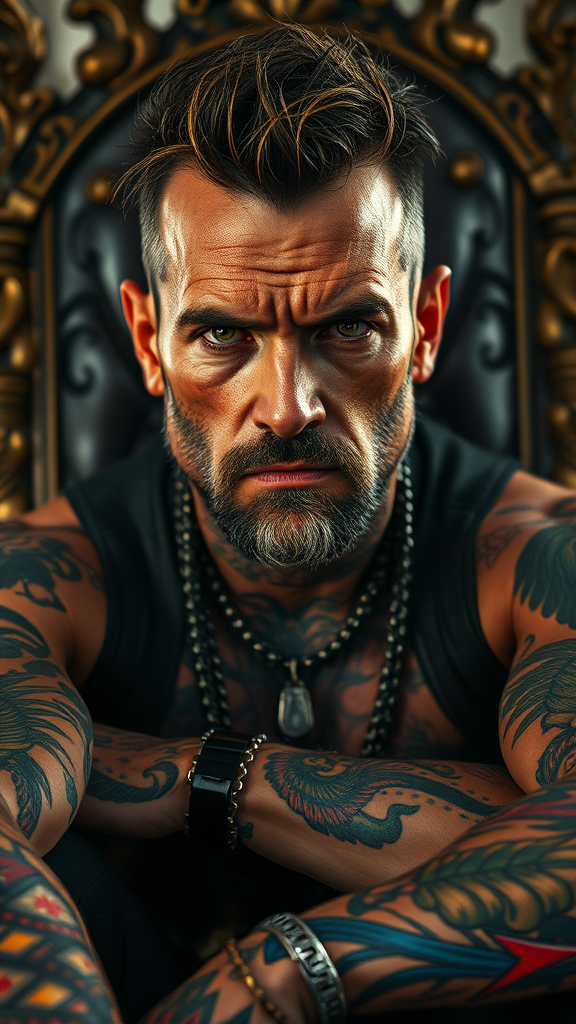 An intense, rugged man exuding strength and raw emotion, dressed in punk style with vibrant tattoos covering his skin, sits regally on a throne reminiscent of a fantasy realm. His piercing gaze meets the viewer, a portrait captured with intricate attention to every rough detail of his weathered face in a hyper-realistic, photo-like quality. The frame offers a full-length view of his commanding presence, enhanced by soft, diffused lighting that casts cinematic shadows. The scene is rendered in ultra-high 8k resolution, with colors presented in rich, high detail, creating a sharp focus image with an edgy, raw art style.