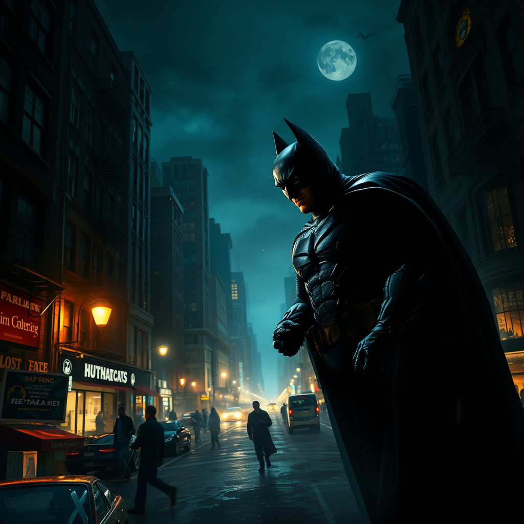 An intense scene of Batman patrolling Gotham City at night, evoking the dramatic ambience of a Christopher Nolan film. The cityscape is cloaked in shadow, painted with horror and filled with suspense. The intricate details capture the lifeline between chaos and salvation, with dramatic light casting elongated shadows across the gritty streets. Hidden details in every corner create an atmosphere of apprehension and narrative depth. The image is hyper-realistic, capturing the colorful facets of urban life amidst the darkness, rendered in stunning detail at 8K resolution, achieving a lifelike realism that immerses the viewer in this vibrant yet terrifying world.