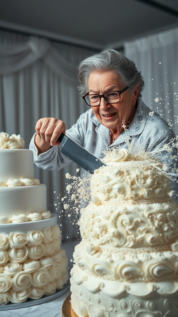 An intense scene unfolds as a wide-angle lens captures the dramatic moment of a bespectacled grandmother in pajamas fiercely slicing into a multi-layered, ornate wedding cake with a large knife. The lighting glows a stark white, highlighting her tightly gripped hands and an expression combining determination with a hint of fierce emotion. In a burst of chaos, the cake erupts into a spray of crumbs and fragmented pieces, as if serving as an outlet for her inner frustrations. The background reveals the wedding catering setup, featuring pristine white elements.